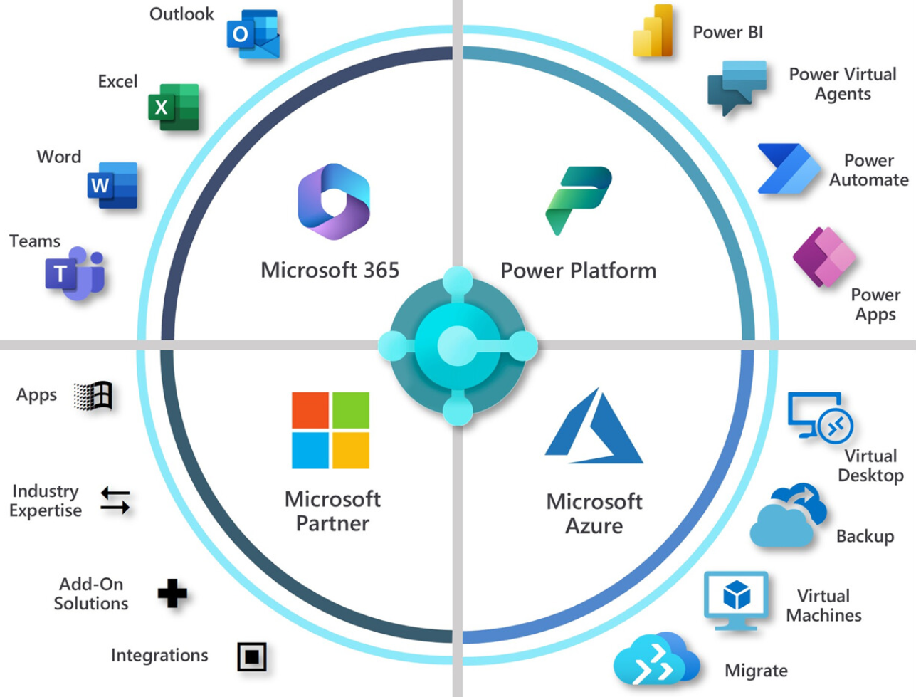 Azure services provide security and advanced analytics, while Teams and SharePoint improve collaboration and document management. Dataverse ensures consistent data across all applications, creating a unified, productive business environment.